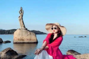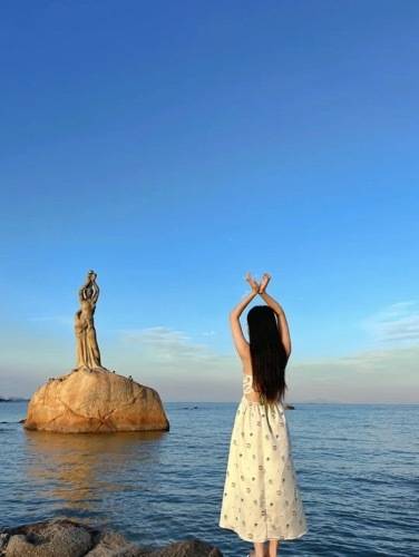 【珠海渔女】望月山下。有位伊人,临水遥望。位于珠海风景秀丽的香炉湾畔,矗立着一尊巨型石刻雕像——珠海渔女,她领戴项珠,身掮渔网,裤脚轻挽,双手高高擎举一颗晶莹璀璨的珍珠,带着喜悦而又含羞的神情,向世界昭示着光明,向人类奉献珍宝。