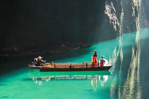 当抵达峡谷底部,便是本次行程的高光时刻 —— 网红「漂浮小船」体验。轻轻踏上小船,瞬间仿若踏入了世外桃源,悠悠飘荡在碧水青山之间。