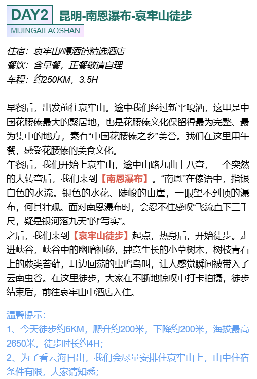 2、全程住宿费4晚(昆明四钻酒店1晚,哀牢山/嘎洒乡镇酒店1晚,墨江精选酒店1晚,元阳梯田景区酒店1晚;