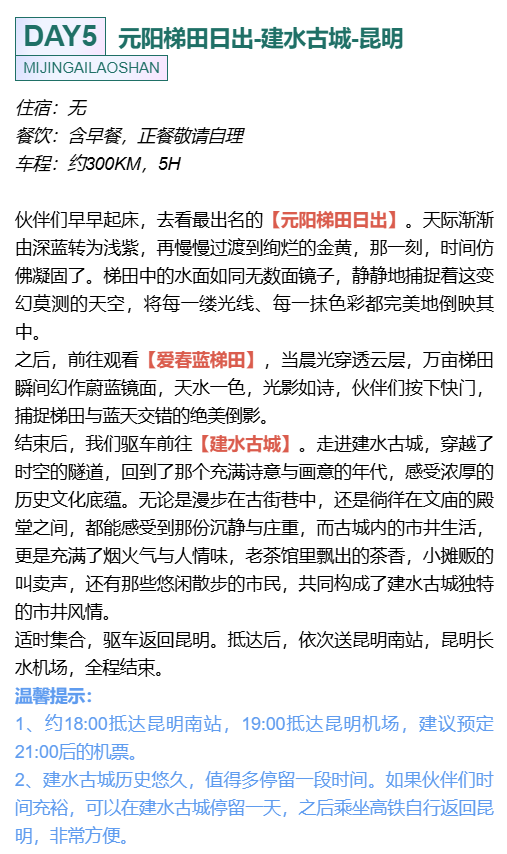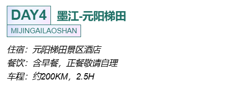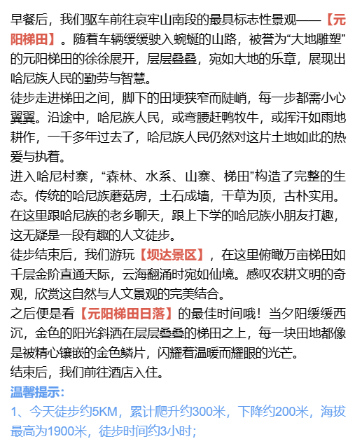 4、所列景区首道门票:元阳梯田景区(凭有效证件产生门票减免的,将退相关票费用哦);