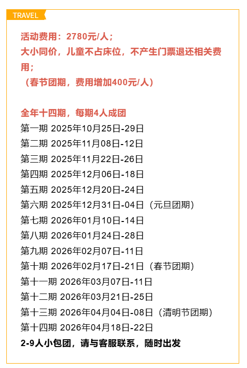 箱包:全程轻装行走游玩,无需背负行李,但请带背包或小行李箱出行(24寸以内);
