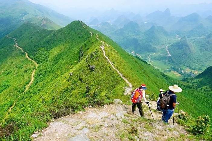 在阳山众多的峰林中,牛鼻村与湖洞村之间,隐藏着一条美丽的徒步穿越线路,这条徒步穿越线路长约13公里的徒步线路,人们把它称作牛湖线。