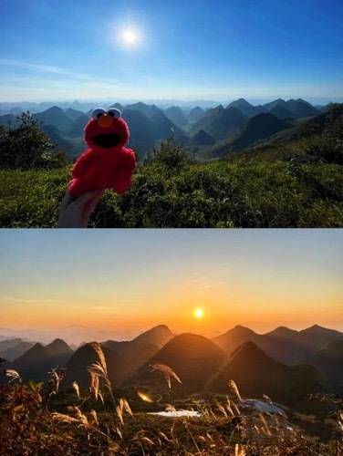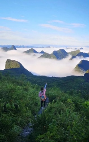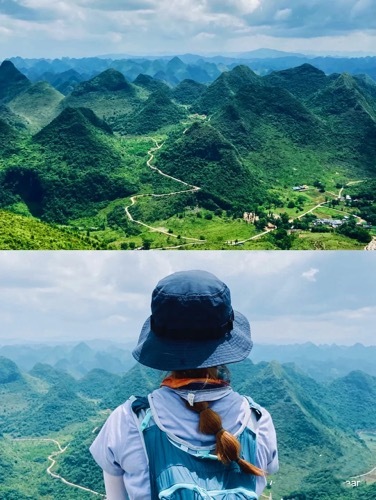 12:00 到达最高点,在这里欣赏最美的峰林全景,这里也是最适合拍照大打卡点之一。稍作休息,午餐自带干粮,后开始下山,一路沿着小路和村民修建的台阶山下。