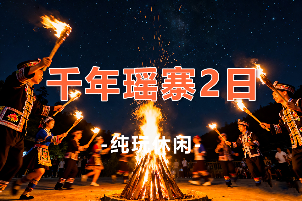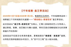 晚上火把巡游篝火晚会(此项费用自理)11月7日起至2026年元旦期间,千年瑶寨景区将举办“燃动瑶山-歌堂狂欢”千年瑶寨盘王季系列活动,从早到晚嗨个不停。除了延续火把节的精彩内容,还有耍歌堂、瑶族风情歌舞、瑶族婚俗表演、篝火晚会等节目轮番上演,让你感受到最原汁原味的瑶族特色的同时,直接把体验感拉满!