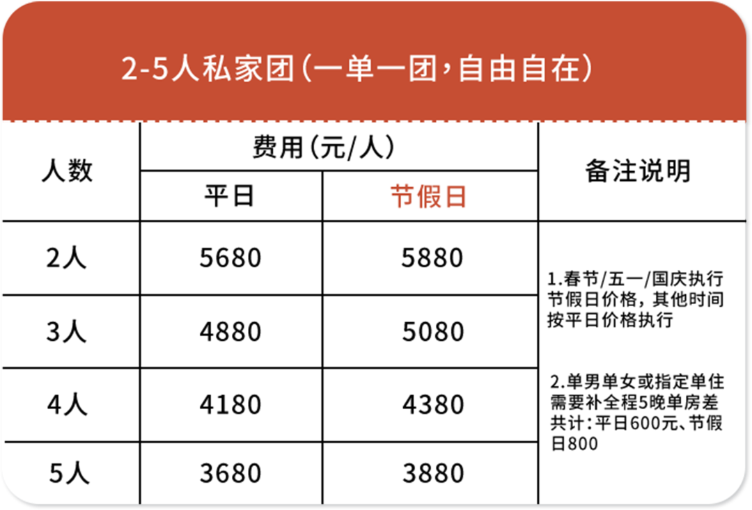 ➂ 单房差:单人报名默认同性拼房(拼房不成功无需另付单房差);指定单住或1成人带1儿童(需补全程5晚单房差价共计:平日600元/春节.五一.中秋.国庆800元)2人一起报名默认住1间房(如需分开住请主动说明)