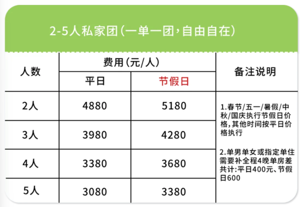 ➂ 单房差:单人报名默认同性拼房(拼房不成功无需另付单房差);指定单住或1成人带1儿童(需补全程4晚单房差价共计:平日400元/春节.五一.暑假.中秋.国庆600元)2人一起报名默认住1间房(如需分开住请主动说明)