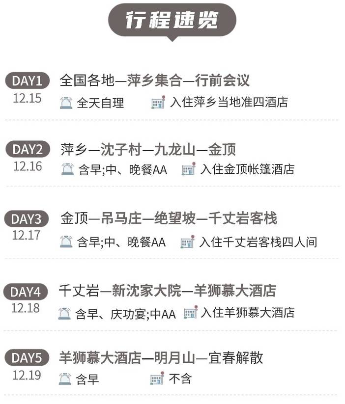 备注:今天需要自己背行李下山,明月山徒步台阶比较多,如选择A方案的小伙伴需自费小火车50元、电瓶车15元、缆车70元,总计135元。选择B方案赶时间的小伙伴需自费缆车70元下山。