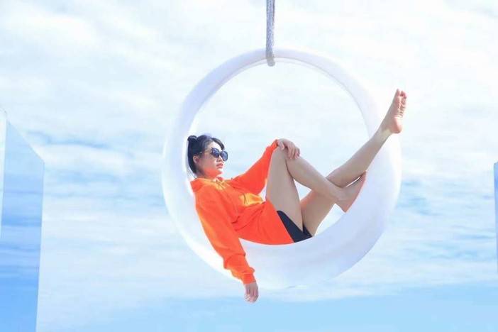 1、颜色:全身浅色系是最为稳妥的选择,跟碧海蓝天的背景会非常协调,或者可以选择上半身浅色+下半身鲜艳色系的组合,如白衬衣+红色半裙,在画面里会更加亮眼一点。