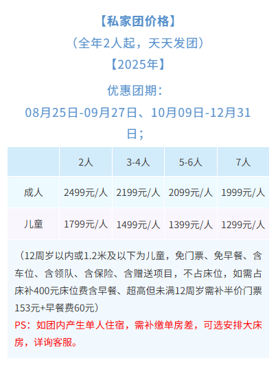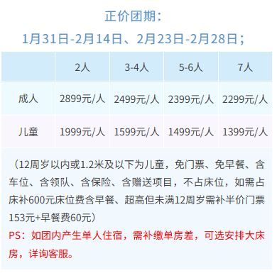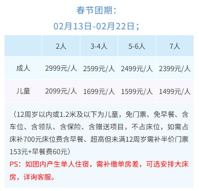 6、报价是除多人间外其他按照2人入住1间房计算的价格,单人报名者我们会尽量安排拼房,如无法拼房则自补单人房间差价;