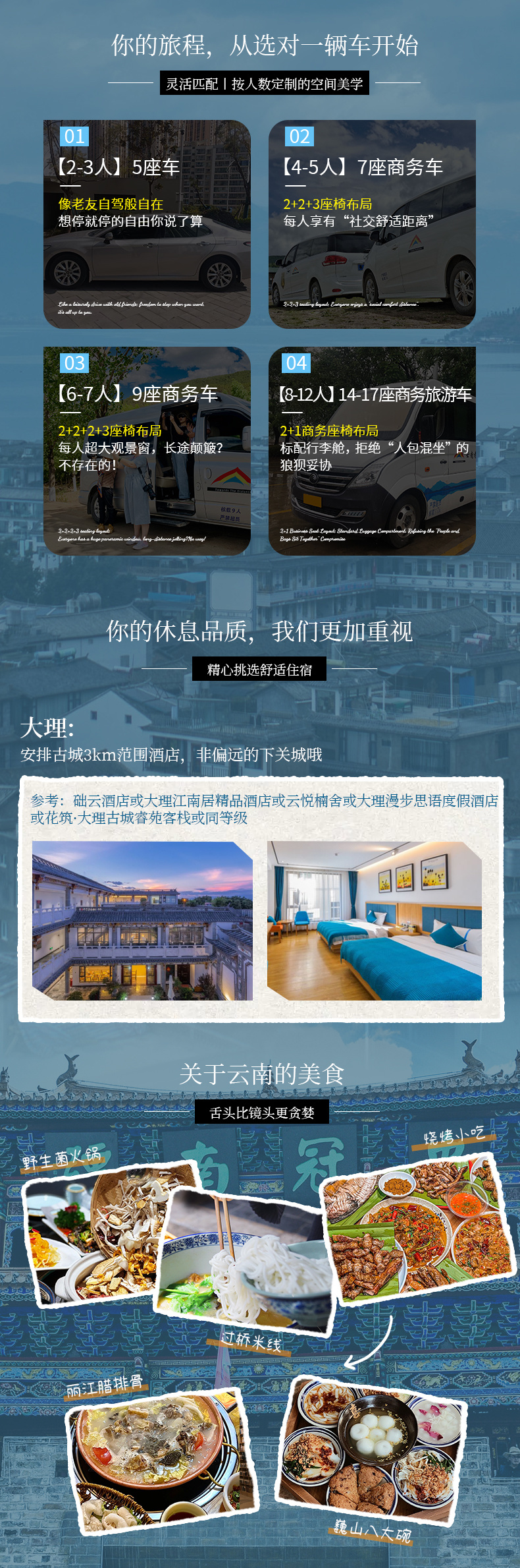 3、用车:2-3人安排5座车,4-5人安排7座商务车,6-7人安排9座商务车;