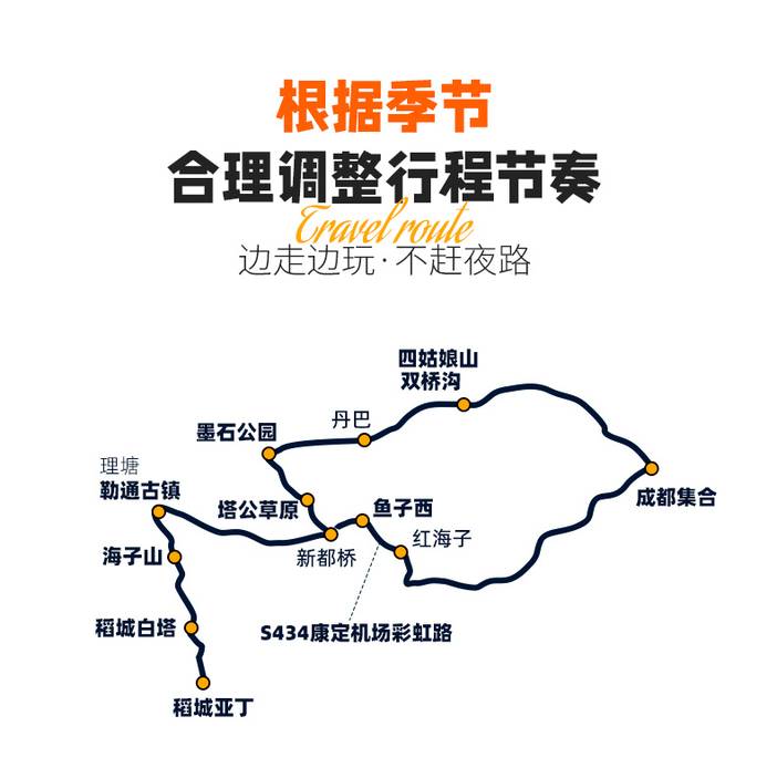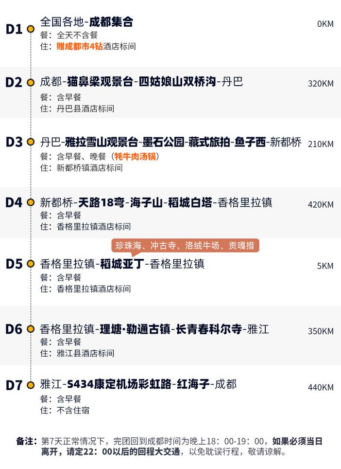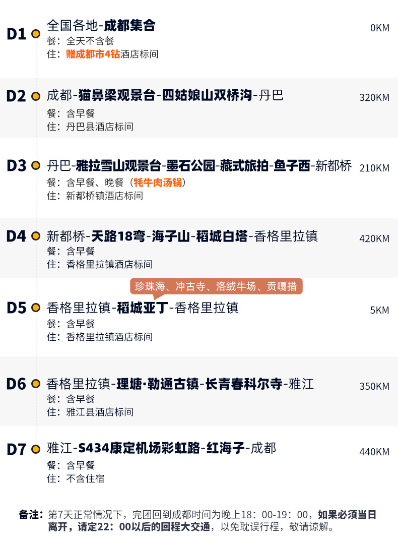 (1)以上行程时间安排可能会因天气、路况等原因做相应调整,正常情况下完团回到成都时间为晚上18:00-19:00,如果必须当日离开,请定22:00以后的回程大交通,以免耽误行程,敬请谅解;