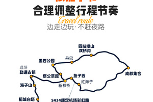 【行程概述】早餐后出发,途中会经过各大旅行博主的拍照圣地【康定机场彩虹公路】,这里背靠雅拉雪山,遥望贡嘎群山,分分钟拍出雪山公路大片,惊艳朋友圈。而后抵达一处秘境海子--【红海子(加呷腊)】,这里可以包揽整个湖泊和雪山。晴天,可以看到笔架山(5880M)、田海子峰(6080M)等一众雪山,拍照更是一绝,海子和雪山遥相呼应,怎么拍都好看。游玩后我们朝着甘孜藏族自治州首府——《康定情歌》中的康定行进,随后上【雅康高速】,穿越二郎山隧道,感受阴阳两重天,经雨城雅安上成雅高速返回成都。