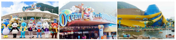 海洋公园,水族馆、鲨鱼馆、海洋剧场,海豚、海狮、杀人鲸表演,过山车、摩天轮、海盗船等游乐设施。山下的海滨乐园有海洋奇观、环回水世界、香港老大街和双龙奇缘表演,水族馆内的海龙王餐厅可一边欣赏水底世界一边品尝美食。高峰乐园更刺激,以游乐场嘉年华为主,包括海洋剧场表演,全亚洲大的独立水母馆,冰极天地南北极生物园区,热带雨林天地以热带雨林为主题,急流天地和动感天地都是刺激的游乐项目。