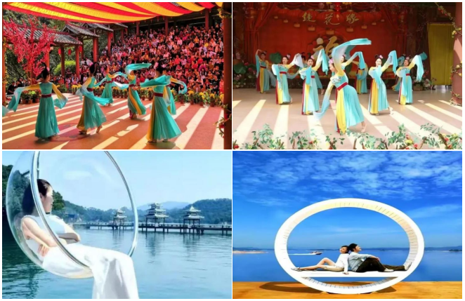 【镜花缘女儿国】欣赏大型客家歌舞表演(周一至周日11:00,14:00,15:20,周日加场10:00)。还可以前往万绿湖畔各种摆拍,玻璃吊蓝、玻璃船、紫藤长廊等网红打卡项目。