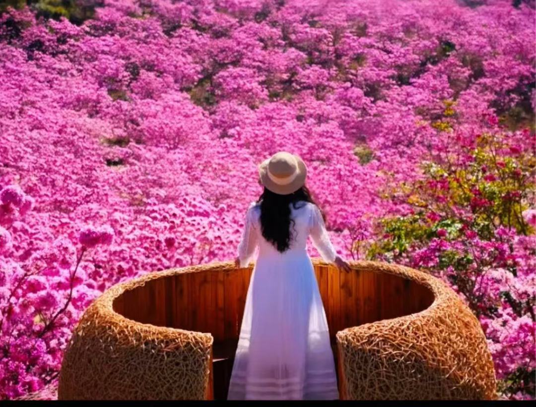 连绵起伏的山丘宛如铺上了粉紫色的锦毯,远远望去,像一片粉嫩海洋,蔚为壮观吸引游客咔嚓拍起来...
