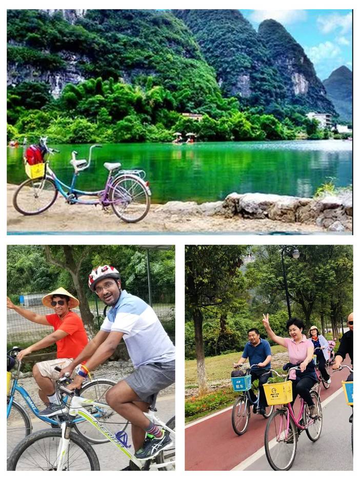 13:00挑选精美自行车游十里画廊,观遇龙河油风光,因沿路风景秀丽,如诗如画,被称为阳朔十里画廊,自行车骑行无疑是十里画廊的最佳游玩方式,对体力没有信心的游客可以选择升级电动车(需加30元),不需要人力踩,不担心出汗,在这个季节,是游览阳朔山水的最佳选择,途经工农桥、大榕树、月亮山等景点,可以随意拍照