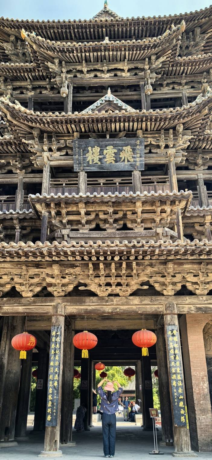 首先走进【飞云楼】。这座与应县木塔齐名的“中华第一木楼”,通体榫卯相扣,无一颗铁钉。仰望其斗拱层叠、檐角飞扬的姿容,宛如繁花盛放、云翼凌空,中国木构建筑的智慧与美学在此登峰造极。